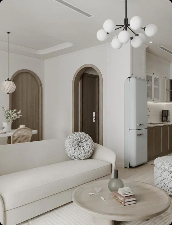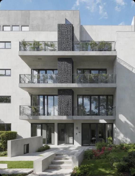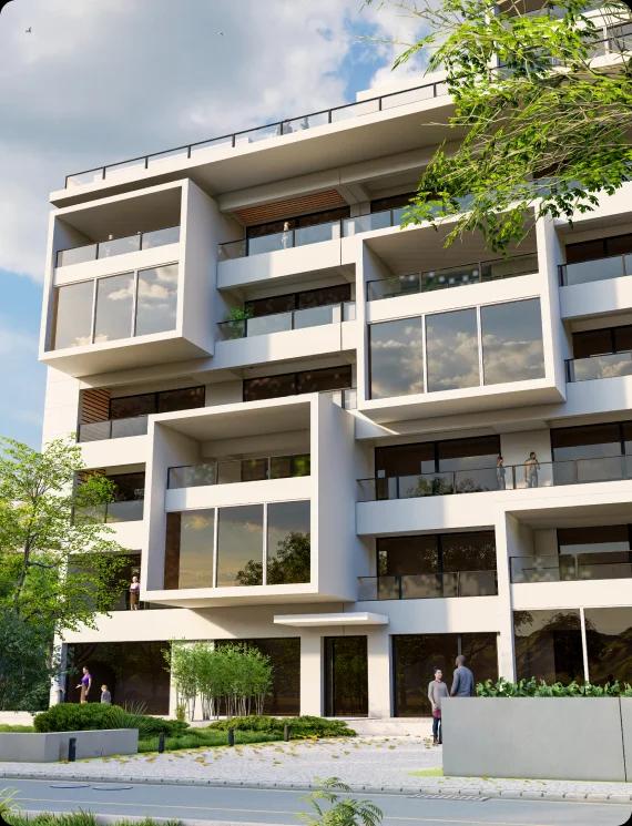 The building features luxury apartments with 1-4 bedrooms. Five apartments include a garden and private pools. The rooms are spacious and bright with large windows.