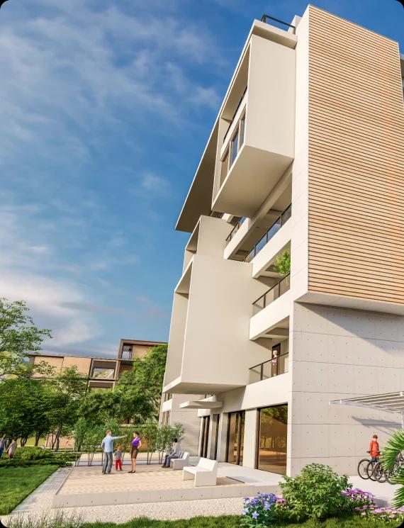 Our architectural visualization show-cases the upcoming construction project, highlighting its diverse uses and illustrating the environmentally friendly and sustainable aspects of the building.